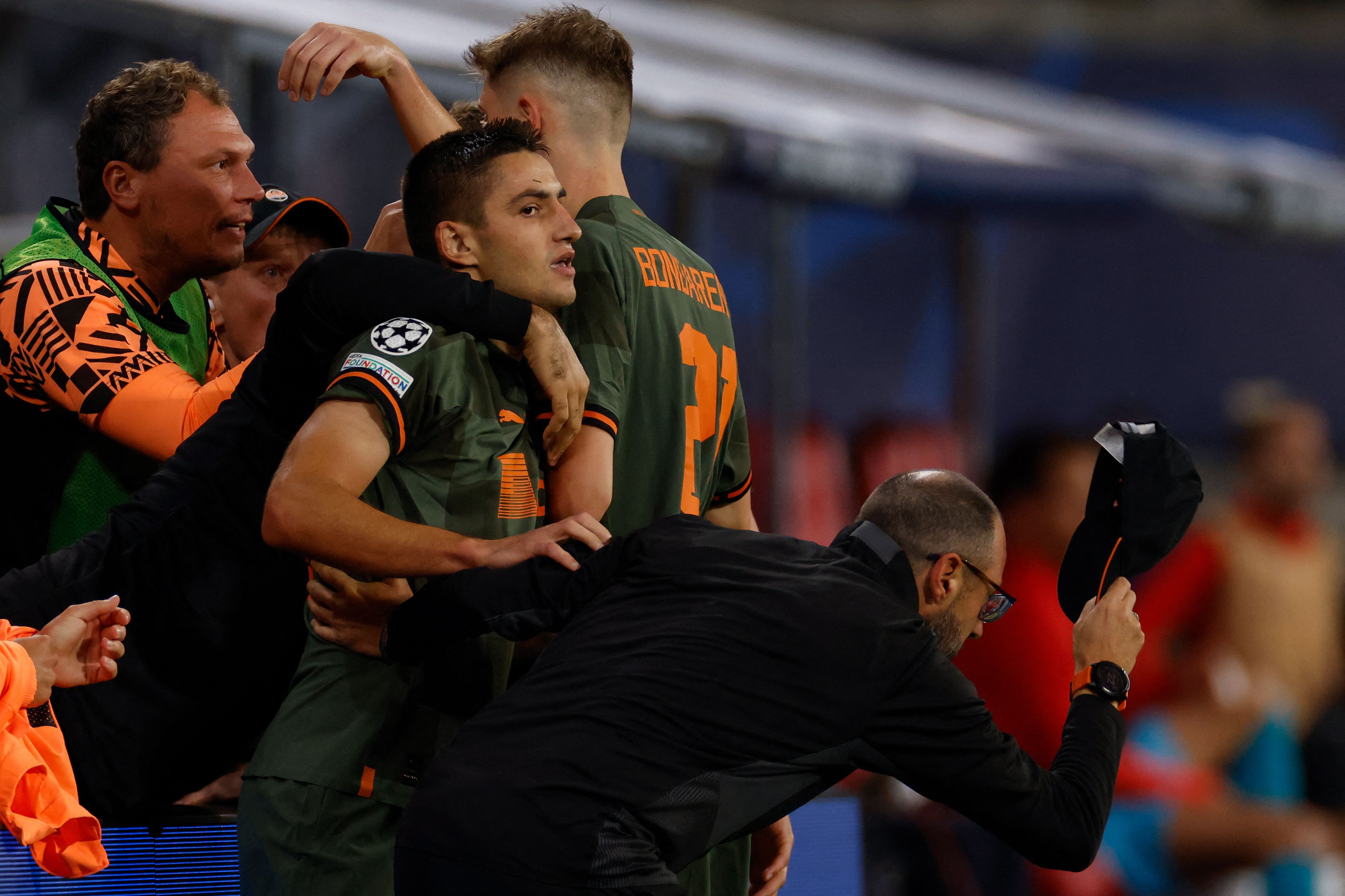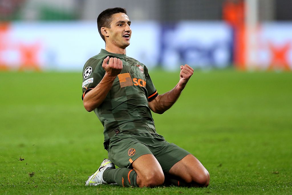 Marian Shved of Shakhtar Donetsk celebrates after scoring their team’s first goal during the UEFA Champions League group F match between RB Leipzig and Shakhtar Donetsk at Red Bull Arena on September 06, 2022 in Leipzig, Germany. (Photo by Cathrin Mueller/Getty Images)