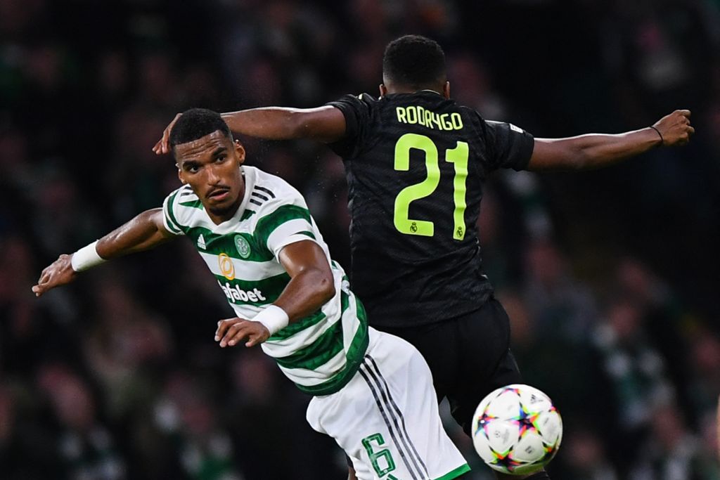 Moritz Jenz and Real Madrid’s Brazilian forward Rodrygo ( fights for the ball with during the UEFA Champions Leaguel match between Celtic and Real Madrid, at the Celtic Park on September 6, 2022. (Photo by ANDY BUCHANAN/AFP via Getty Images)