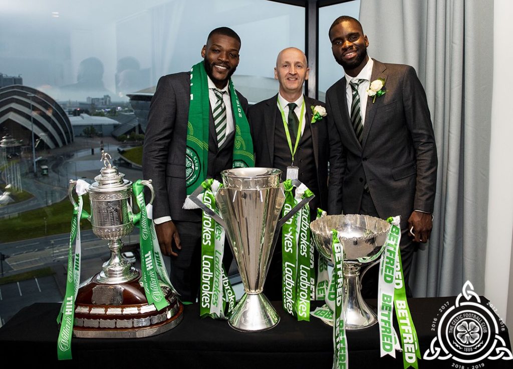 The Celtic Star’s Matt Corr with Olivier Ntcham and Odsonne Edouard and our three trophies.