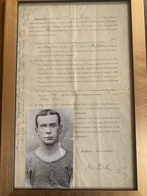 The picture below, as you can see, is of Andrew Donaldson’s Celtic contract signed by both Willie Maley and James Kelly.