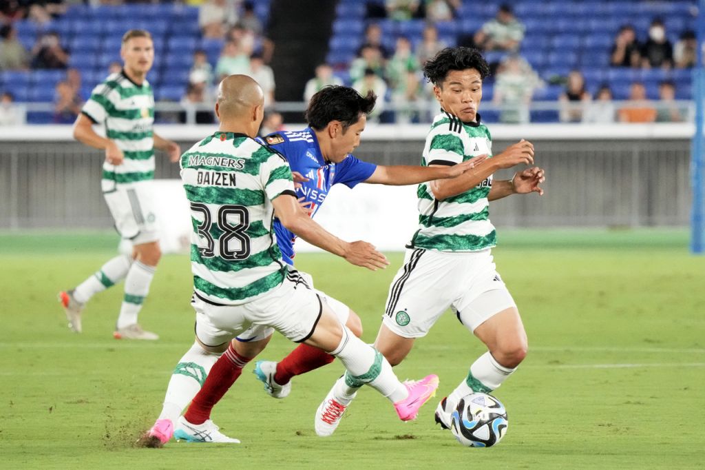 Celtic’s midfielder Reo Hatate and striker Daizen Maeda during a friendly football match between Japan’s Gamba Osaka and Celtic at Suita City Stadium in the city of Suita, Osaka prefecture on July 22, 2023. (Photo by PAUL MILLER/AFP via Getty Images)