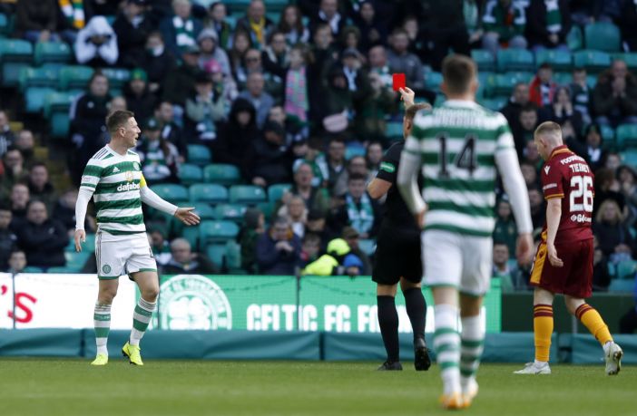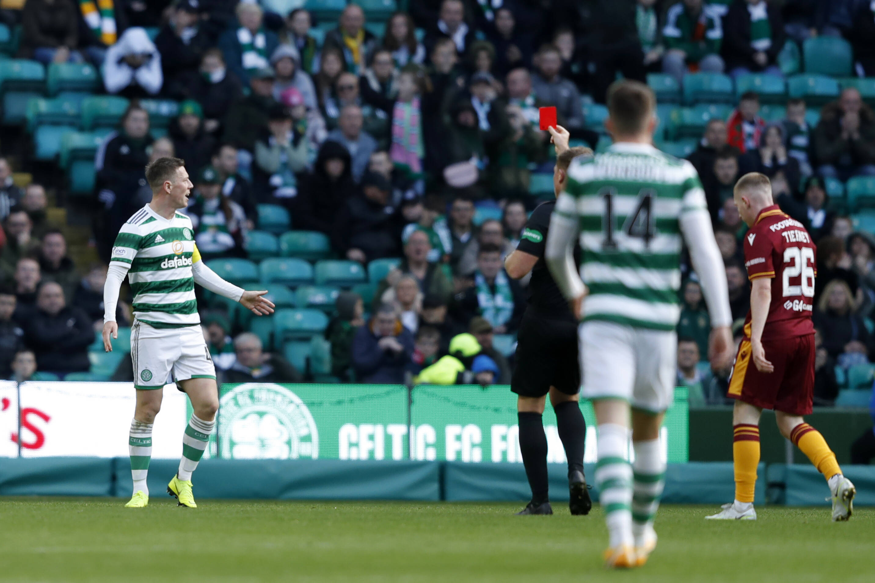 Celtic v Motherwell – cinch Premiership – Callum McGregor is shown a red card. Photo Will Matthews