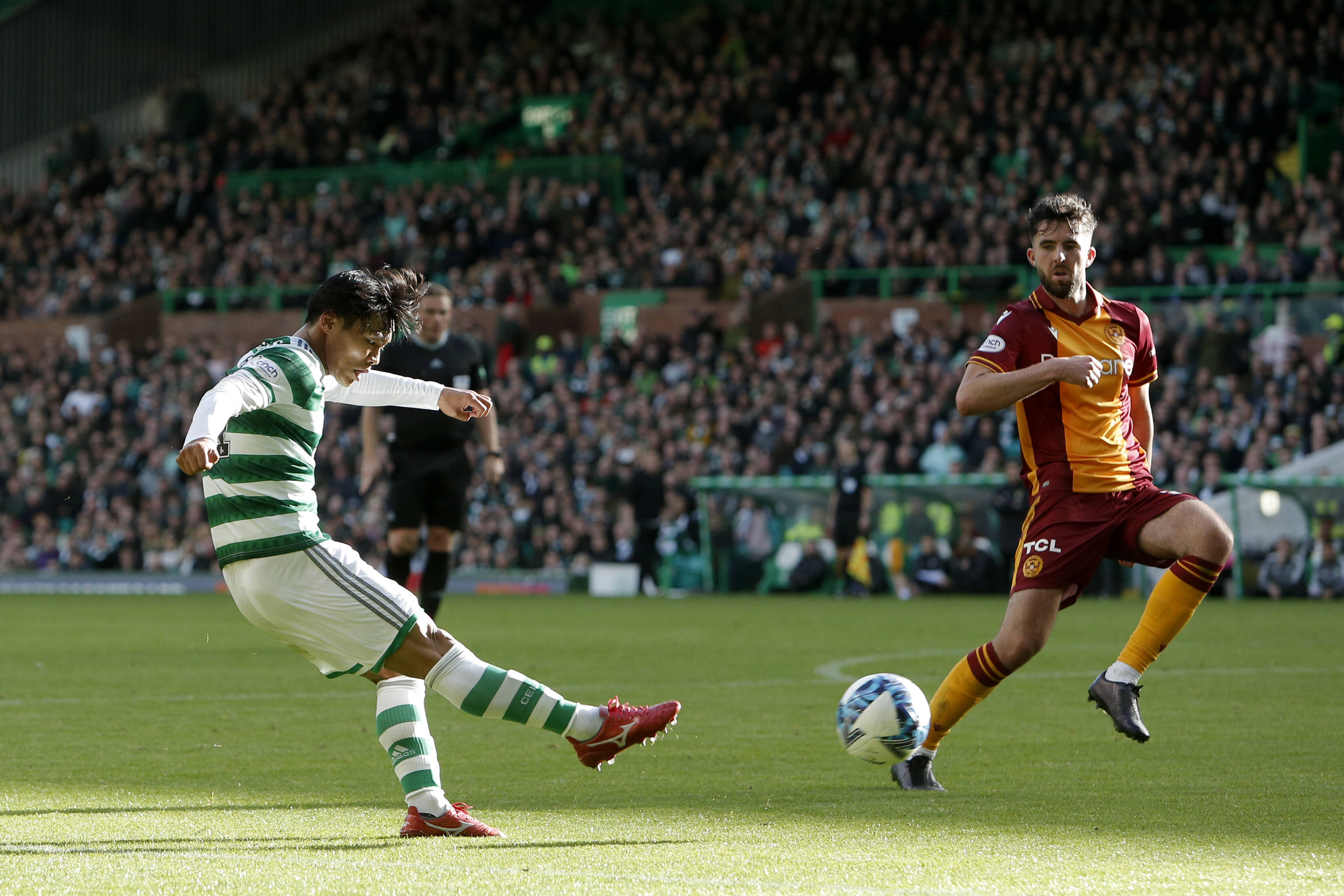 Celtic v Motherwell – Reo Hatate shoots towards goal during the cinch Premiership match at Celtic Park, Saturday October 1, 2022. Photo Will Matthews