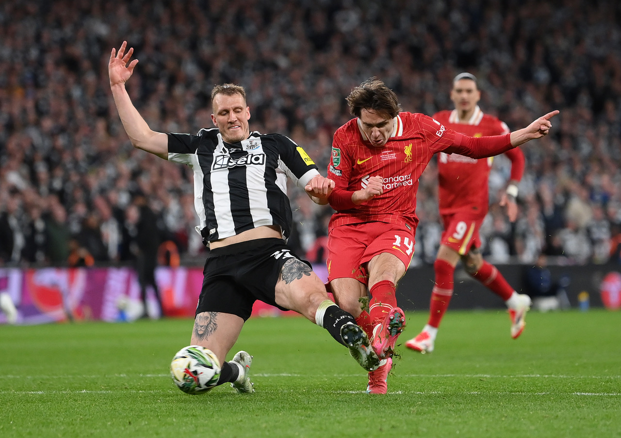 Federico Chiesa of Liverpool scores his team’s first goal whilst under pressure from Dan Burn of Newcastle United during the Carabao Cup Final between Liverpool and Newcastle United at Wembley Stadium on March 16, 2025 in London, England. (Photo by Justin Setterfield/Getty Images)
