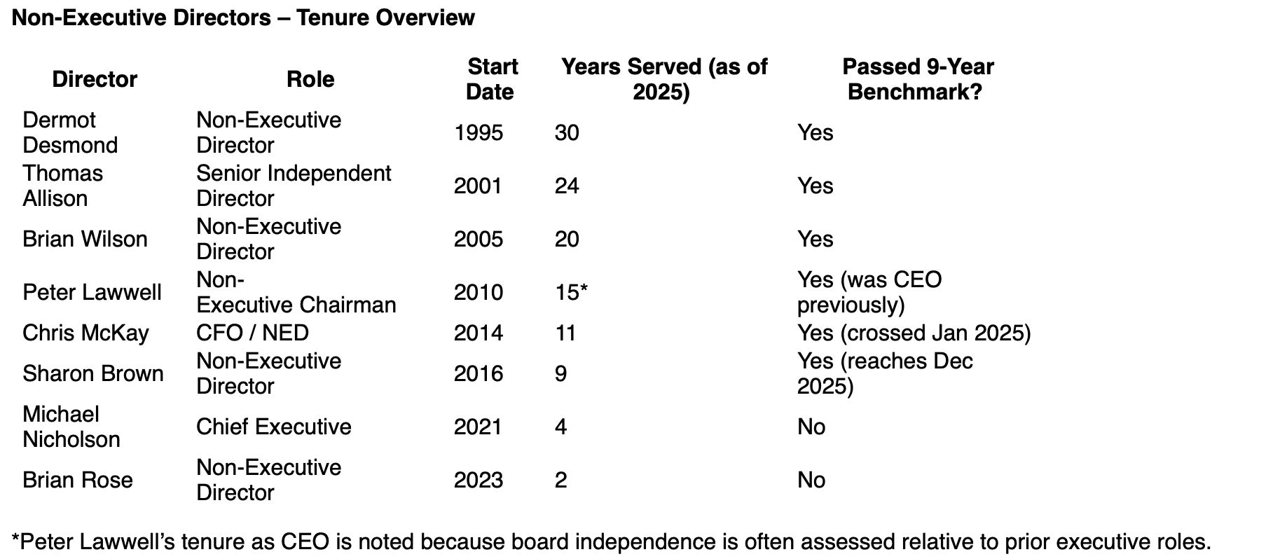The numbers speak for themselves. Under AIM’s softer governance regime, Celtic plc faces no binding obligation to refresh its board after nine years. But independence and oversight are critical. Here is the tenure of Celtic’s current board members: