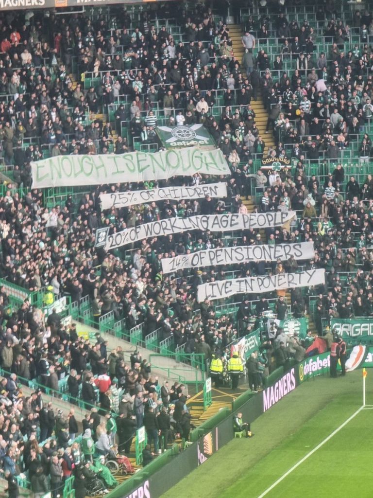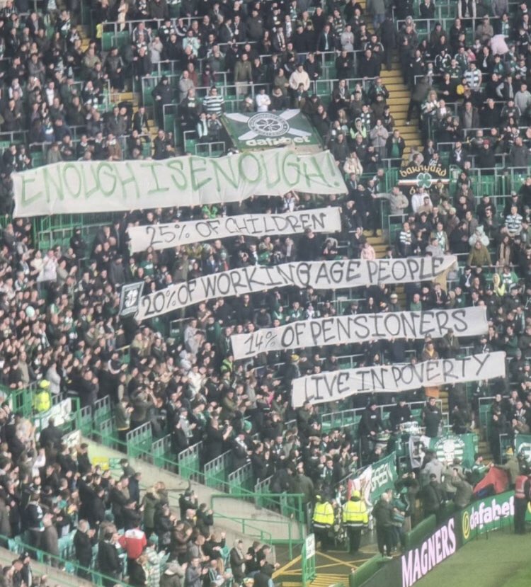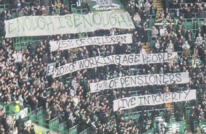 The RMT have praised the Celtic supporters for once again shinning a light on the awful poverty statistics in Britain in 2022. As always, the Green Brigade had a banner aimed at the establishment with their abominable overseeing of poverty rates rising in the UK.
