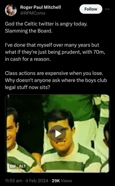 “God the Celtic twitter is angry today. Slamming the Board. I’ve done that myself over many years but what if they’re just being prudent, with 70m, in cash for a reason. Class actions are expensive when you lose. Why doesn’t anyone ask where the boys club legal stuff now sits?”