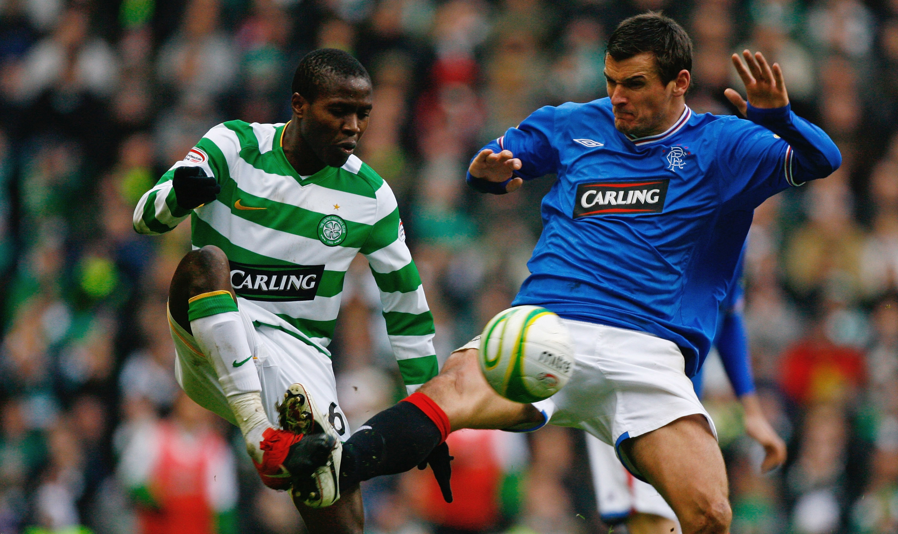 Landry NGuemo of Celtic (L) during the Scottish Premier League match between Celtic and Rangers at Celtic Park on 3 January 3, 2010. (Photo by Jeff J Mitchell/Getty Images)