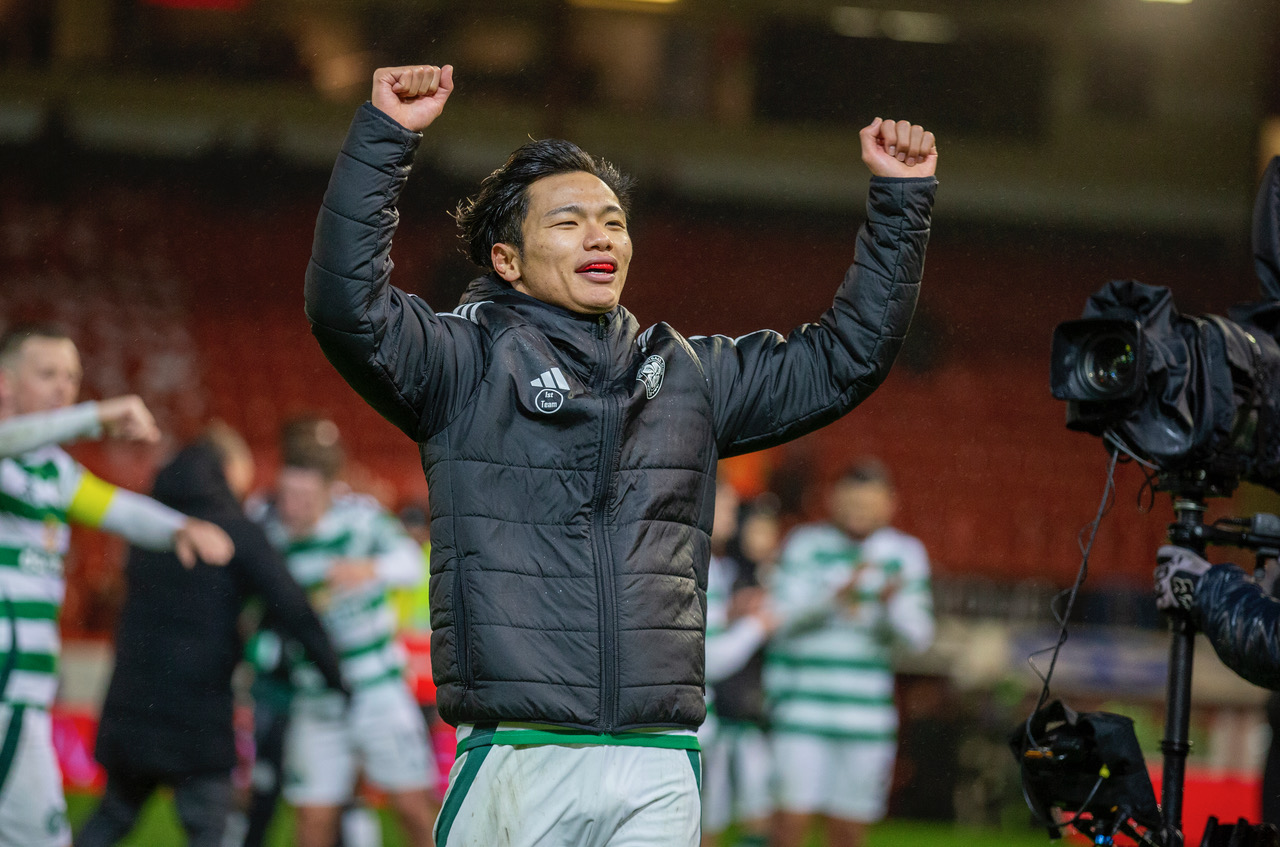 4th December 2024; Pittodrie, Aberdeen, ; Scottish Premiership , Aberdeen versus Celtic; Reo Hatate of Celtic shoots and scores in the 78th minute to make it 1-0 to Celtic .Photo Vagelis Georgariou