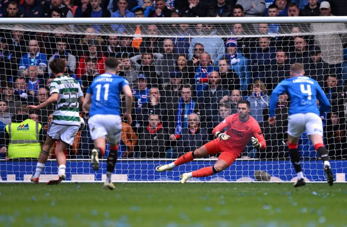 Kyogo Furuhashi is challenged by John Souttar during the Scottish Premiership match between theRangers and Celtic at Ibrox on April 07, 2024 (Photo by Stu Forster/Getty Images)