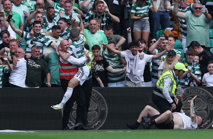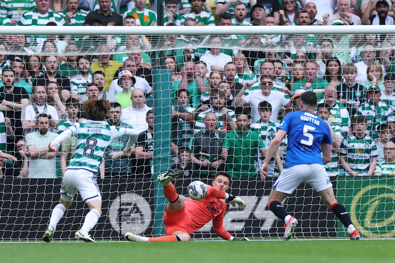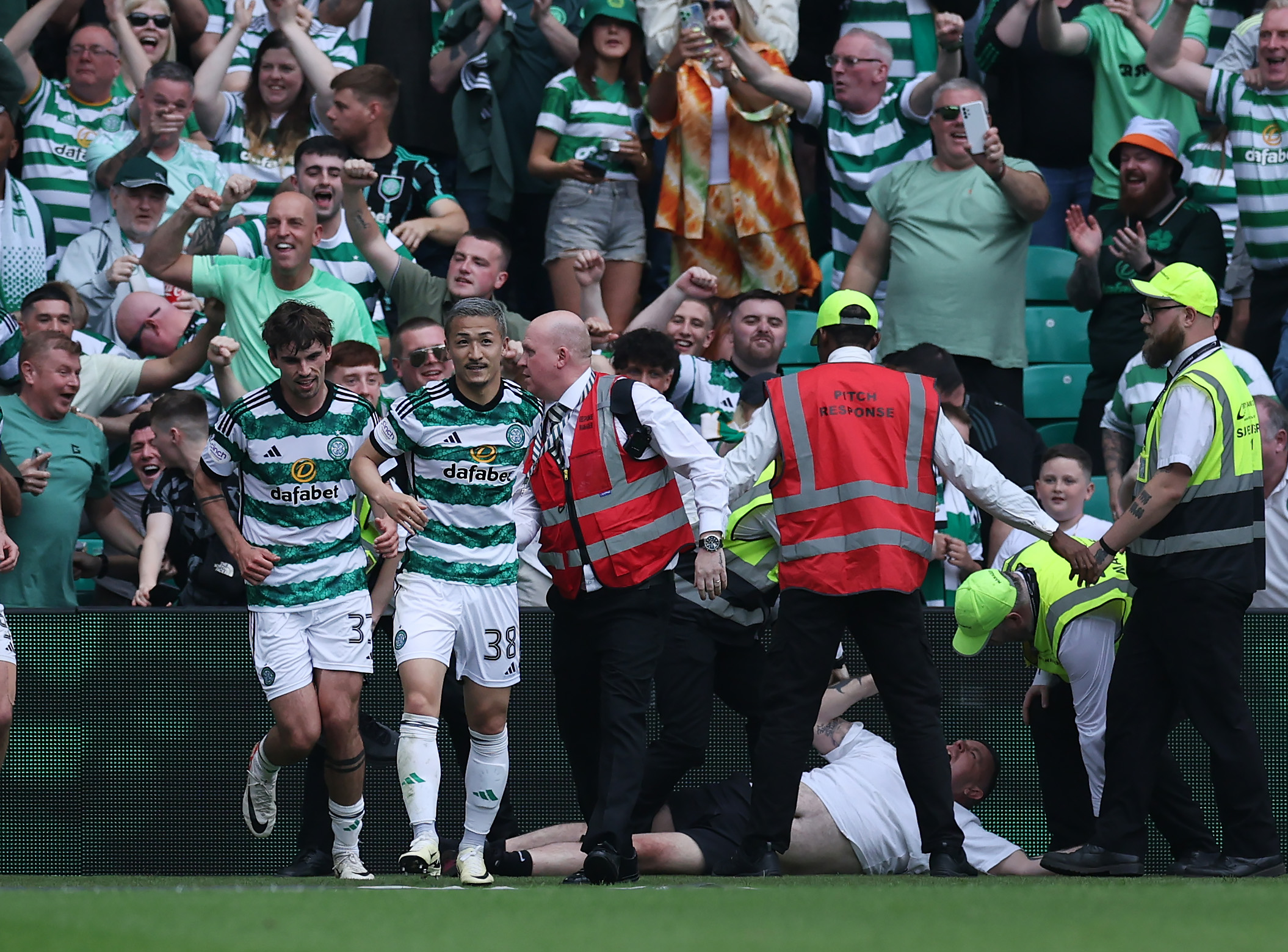 Daizen Maeda celebrates after his cross leads to our second goal during the Scottish Premiership match between Celtic and theRangers at Celtic Park on May 11, 2024.. (Photo by Ian MacNicol/Getty Images)