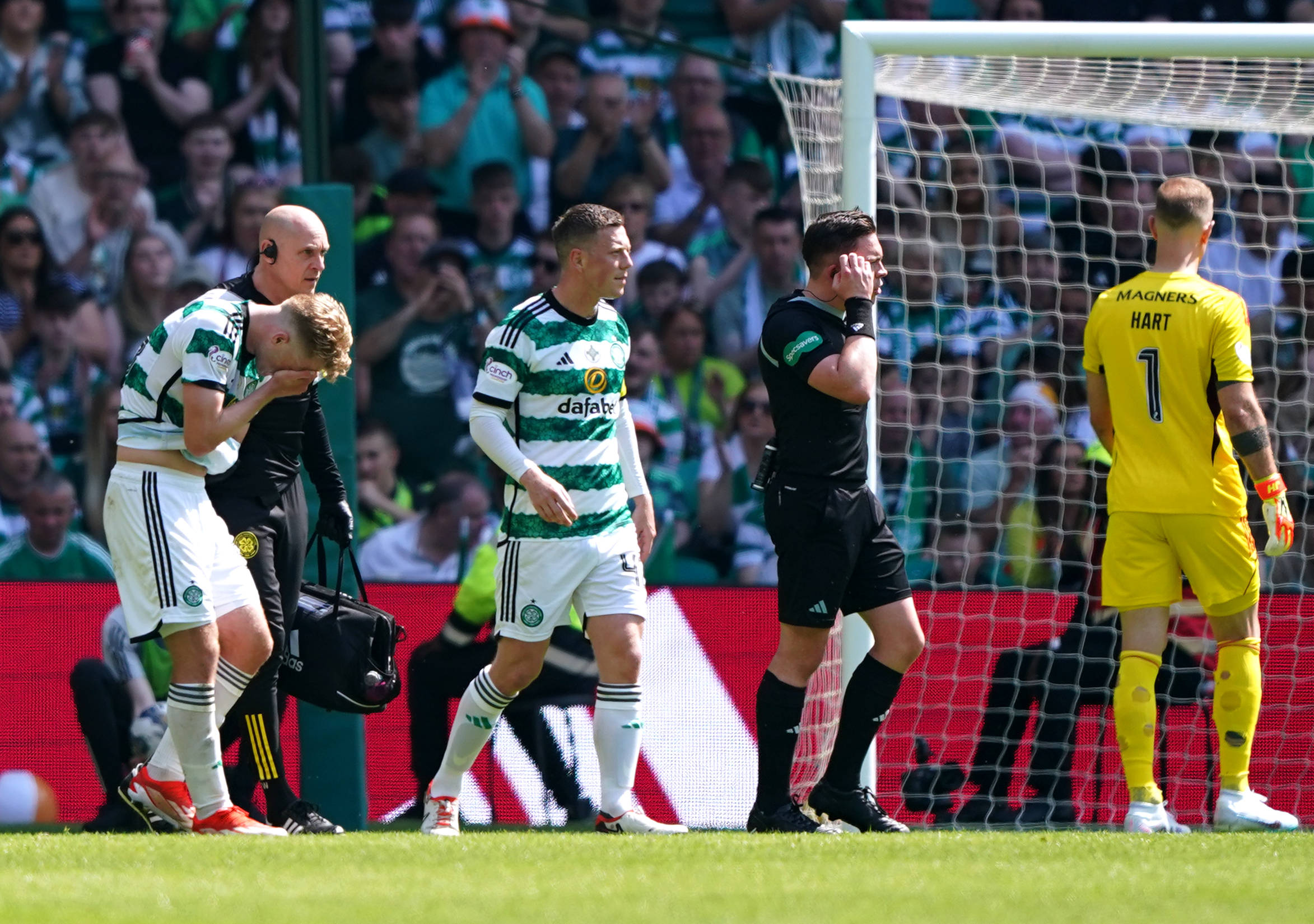 Celtic v St Mirren – Stephen Welsh left leaves the pitch after picking up an injury during the Scottish Premiership match at Celtic Park, on Saturday May 18, 2024. Photo Andrew Milligan