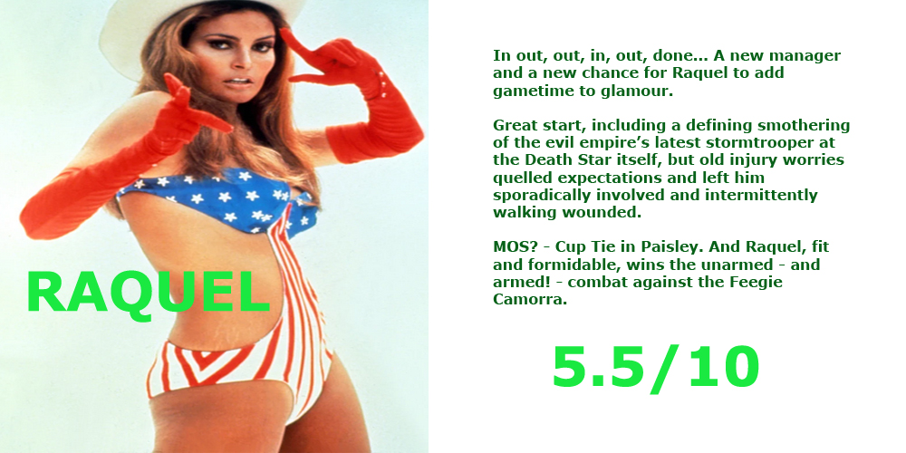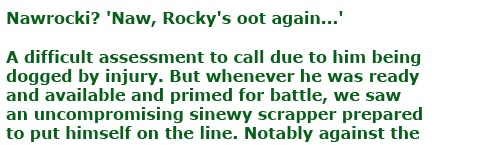 MOS – In the bleak midwinter…56 seconds in v Ross County, scored the solitary match-winner that was so crucial to keep us in contention. Slashed a 20 yarder like Jason Vorhees which scuttled in off a Heelander, reminiscent of Allan Mac leaving a crime scene. They all count, and that one was massive.