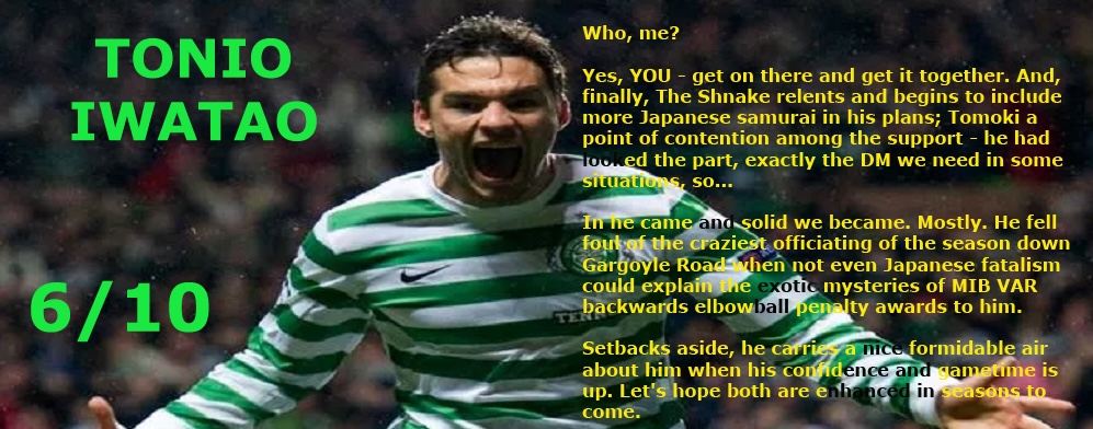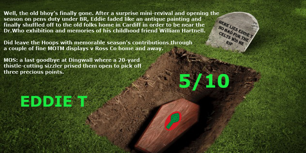 ROXIE – 8.5/10 – When you need them most, the leaders stand up and be counted. And this transitional season showcased Joe’s qualities as they came to the fore on the park – superb and crucial saves at defining moments – and off: fantastic psyche that kept heads up and in the game. This is the end, beautiful friend, the end. It hurts to set you free…From the ‘Thompson 90’ to the Zombie smiting, we thank Joe for many things. The saves, the laughs, the leadership. But most of all we should thank him for his honesty, for rocking up here under great suspicion and being…well, just being Joe. A sound, ‘decent’, honest character who became a real and beloved Celtic keeper in the tradition of unique individuals. And who’ll never need to buy a drink at any bar across the planet wherever a Celt stands, ever. He’ll know then what it all means.