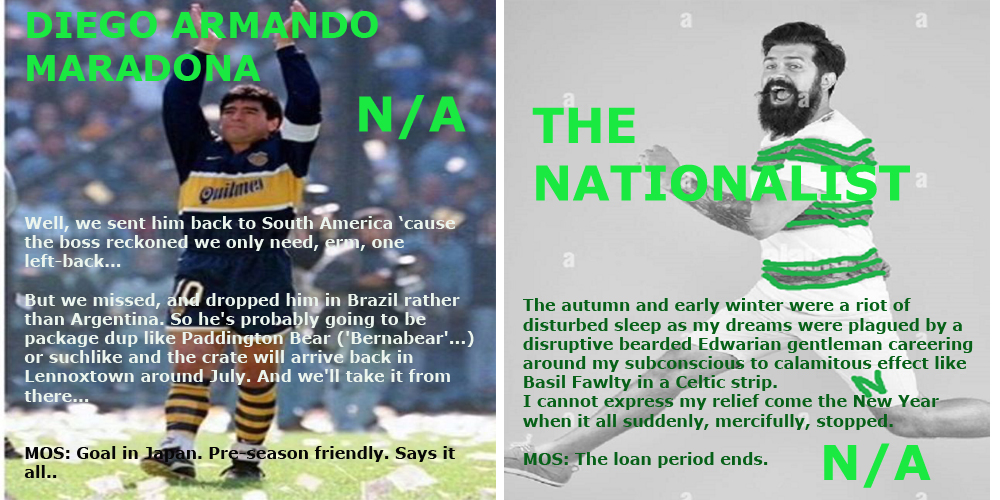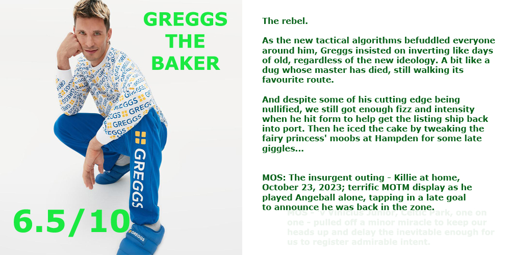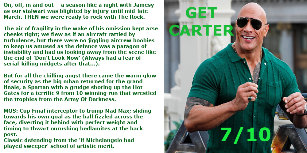WAYNE GRETZKY – 7/10 – You gotta love an AJ interview – he’s so damned North American it’s like listening to Ron Burgundy do a ‘sportscast’ with Ted Lasso. The cheesiness stops right there, however because this Bhoy is a stoical, combative presence – no Zombie shall pass – specialising in navy seal stealth overlaps and supporting ghost recon drifts into the enemy box.