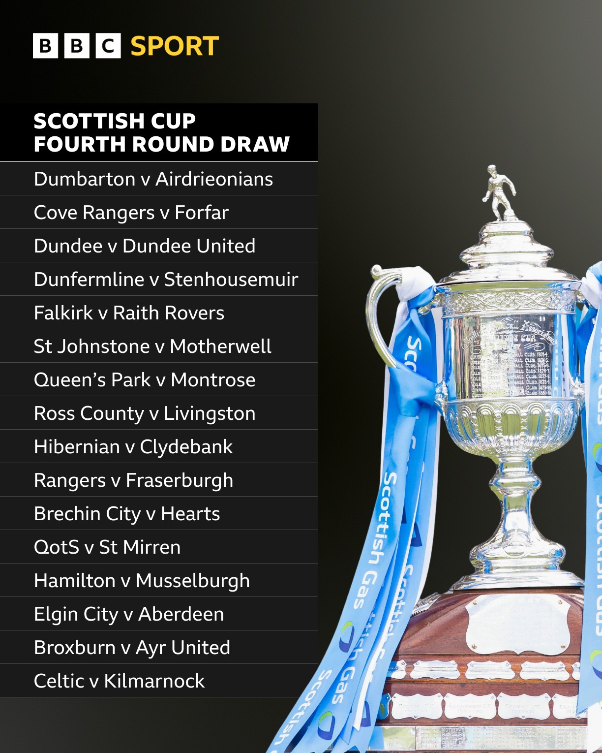 Some of the highlights are Dundee v Dundee Utd which will be a cracking tie, Falkirk v Raith Rovers is another decent tie, as is St Johnstone v Motherwell. theRangers are at home to Fraserburgh. Elgin City host Aberdeen and last out the hat are holders Celtic v Kilmarnock.