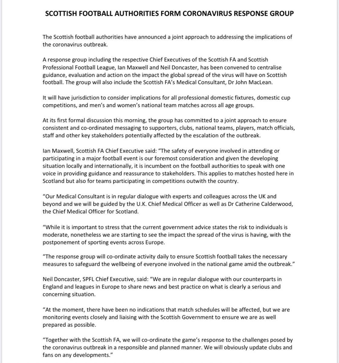 “Together with the Scottish FA, we will co-ordinate the game’s response to the challenges posed by the coronavirus outbreak in a responsible and planned manner. We will obviously update clubs and fans on any developments.”