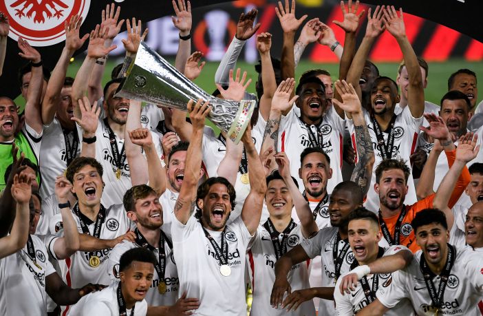 TOPSHOT – Frankfurt’s Serbian midfielder Filip Kostic lifts the trophy as Eintracht Frankfurt players celebrate after winning the UEFA Europa League final football match between Eintracht Frankfurt and Glasgow Rangers at the Ramon Sanchez Pizjuan stadium in Seville on May 18, 2022. (Photo by JAVIER SORIANO / AFP) (Photo by JAVIER SORIANO/AFP via Getty Images)