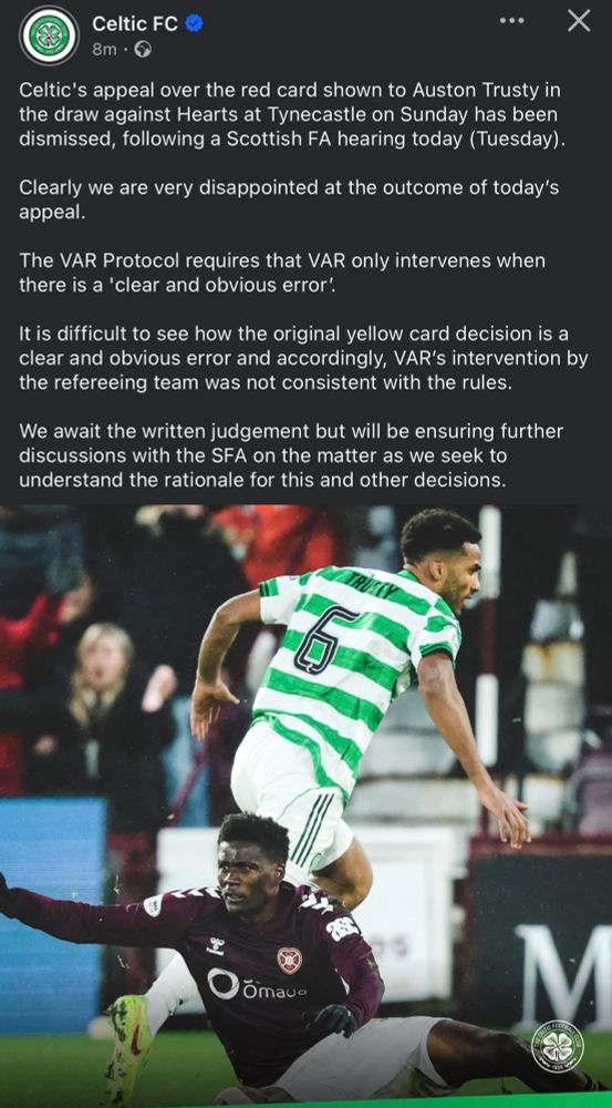 The Scottish FA has just posted this update on their official website regarding Celtic’s appeal against the red card shown to Auston Trusty after a VAR intervention by John Beaton at Tynecastle on Sunday afternoon. Here’s the verdict of the appear as per official Scottish FA website.