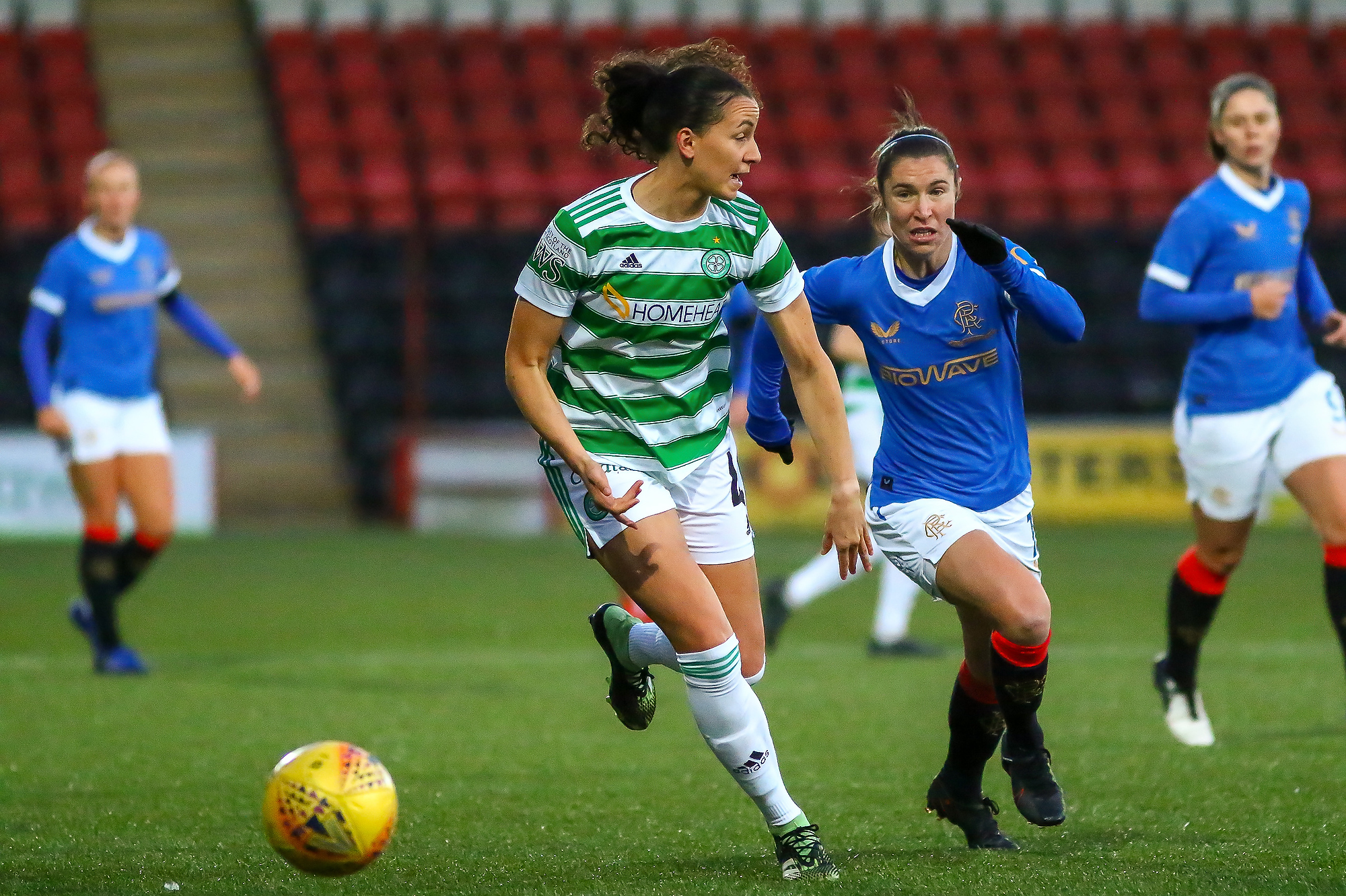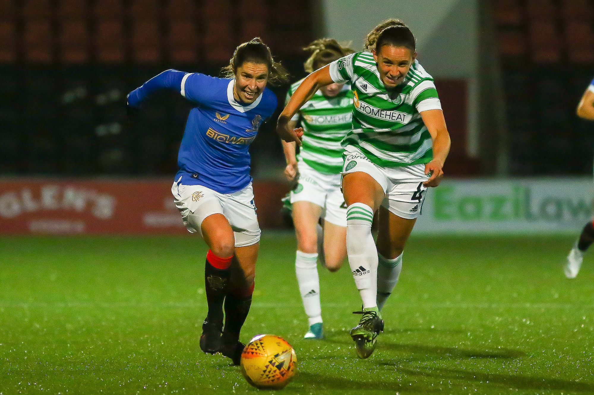 Cheyenne Shorts (#4) of Celtic Women FC & Jane Ross (#13) of Rangers Womens FC in a foot race for the ball during the Scottish Womens Premier League 1 match between Celtic Women and Rangers Women at Penny Cars Stadium, Airdrie, North Lanarkshire Scotland on 07/11/2021