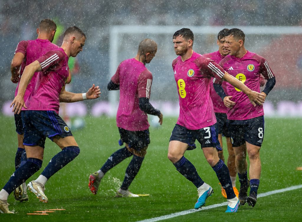 20th June 2023; Hampden Park, Glasgow, Scotland: Euro 2024 Qualifier Football, Scotland versus Georgia; Andy Robertson of Scotland leads the Scotland players during the warm up