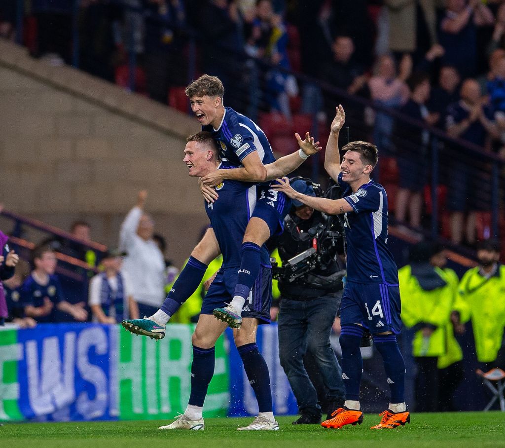 20th June 2023; Hampden Park, Glasgow, Scotland: Euro 2024 Qualifier Football, Scotland versus Georgia; Scott McTominay of Scotland celebrates with Jack Hendry of Scotland and Billy Gilmour of Scotland after he shoots and scores to make it 2-0 to Scotland in the 47th minute