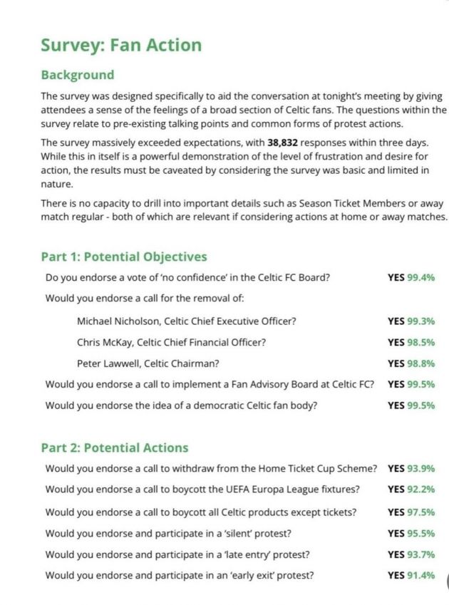 Plans were discussed for an initial protest at Sunday’s match, and there could follow a coordinated campaign across many areas which will be announced in due course with a mandate being given from the survey that the fan organisations have organised over the last week with 38,832 responses from supporters (see below).