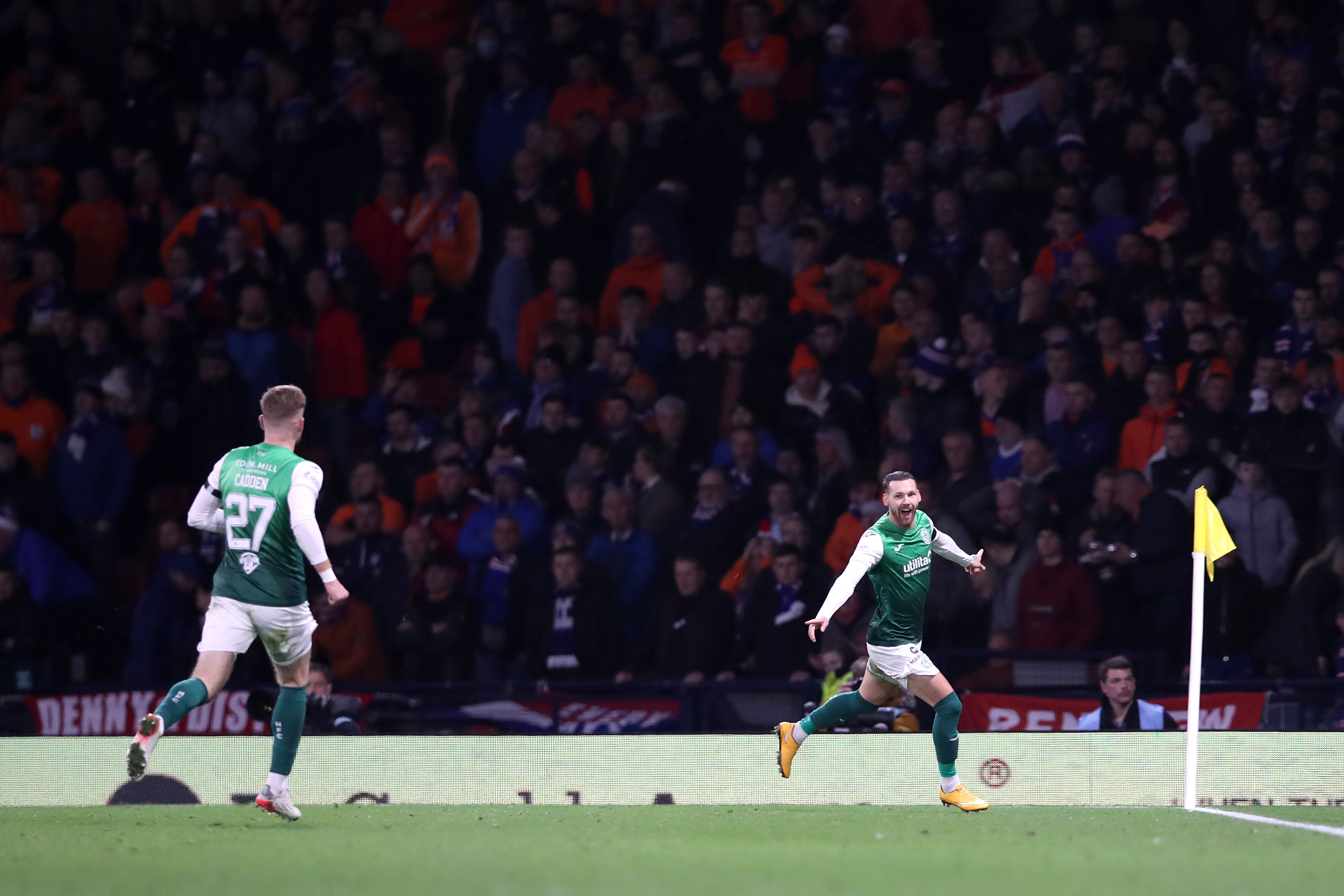 Martin Boyle of Hibernian scores his third goal from the penalty spot, completing his hat-trick against theRangers at Hampden on November 21, 2021.. (Photo by Ian MacNicol/Getty Images)