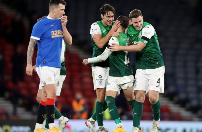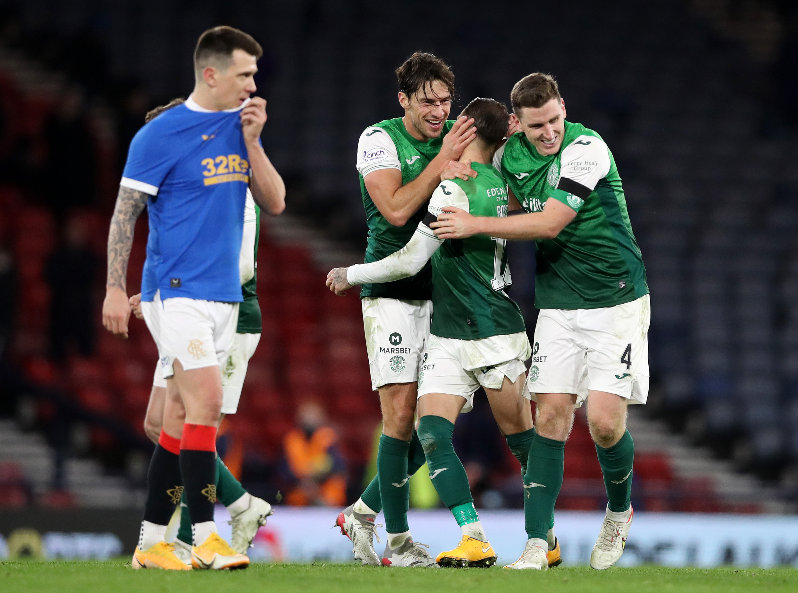 Martin Boyle of Hibernian celebrates with teammates after scoring against theRangers. (Photo by Ian MacNicol/Getty Images)
