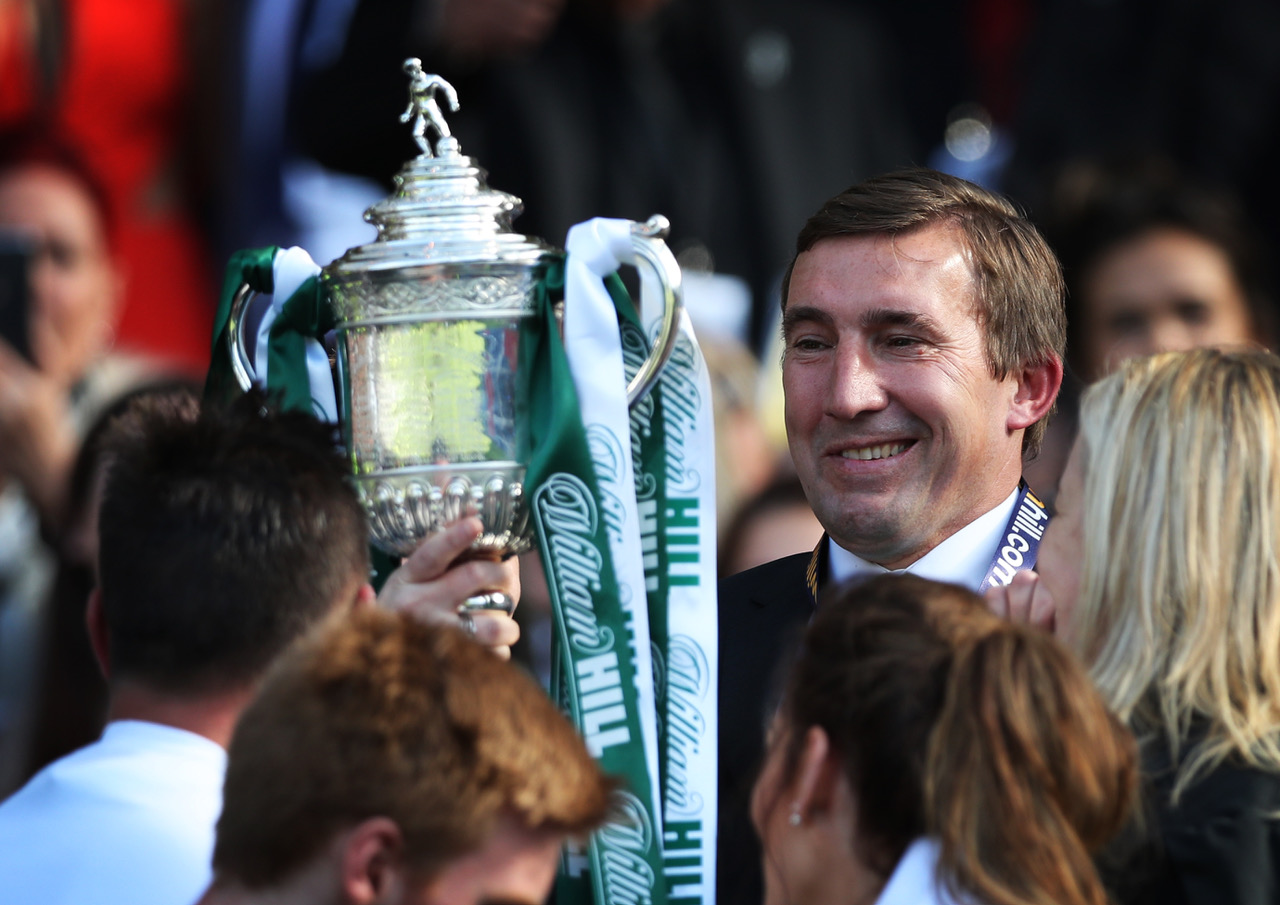 Hibernian Manager Alan Stubbs lifts the Scottish Cup Final after beating theRangers 3-2 at Hampden on May 21, 2016 . (Photo by Ian MacNicol/Getty)