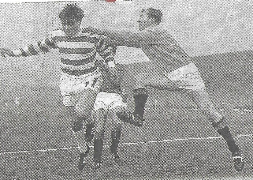 Straight away Stevie Chalmers levelled and just after the hour mark put us ahead. By seventy minutes Charlie Gallagher had scored one of his scorchers when the ball exploded off the underside of the crossbar and into the net following a John Hughes cutback. The most memorable goal for me on a glorious day was number four. Wee Jimmy touched a free kick sideways to Charlie Gallagher who played it square to Bobby Murdoch. That famous referee Tom “Tiny” Wharton (here he is again) was right in the ball’s path. He executed the most delightful movement as he allowed the ball to run through his legs. Bobby crashed it in from thirty yards. Boy, I enjoyed that one. In the last minute Jimmy Johnstone hit the post and Stevie Chalmers put the icing on the cake of a 5-1 trouncing and had scored a hat trick into the bargain.
