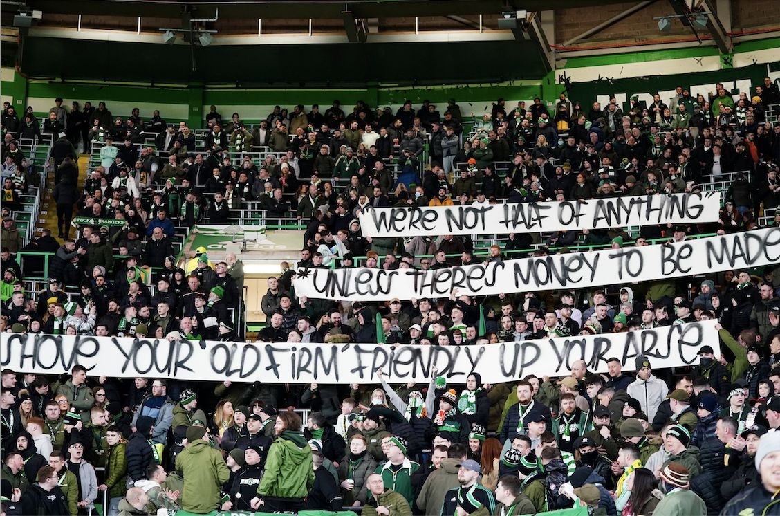 “We’re not half of anything….unless there’s money to be made” read the banner in the North Curve ahead of Celtic’s 2-0 win against St Mirren. Whilst amongst the usual imagery weaponising child abuse, theRangers support scrawled their own messages to their boardroom members on bedsheets. “Money over morals” and “No d£rby friendlies” were two of the banners on display at McDiarmid Park, when second-placed theRangers beat St. Johnstone 1-0.