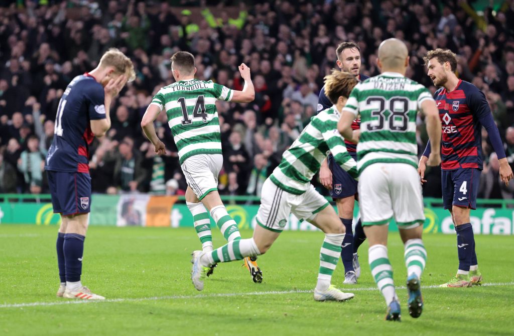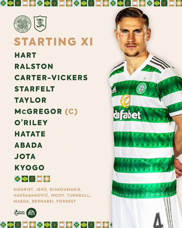 Joe Hart; Anthony Ralston, Cameron Carter-Vickers, Carl Starfelt, Greg Taylor; Callum McGregor, Matt O’Riley, Reo Hatate; Liel Abada, Kyogo and Jota.
