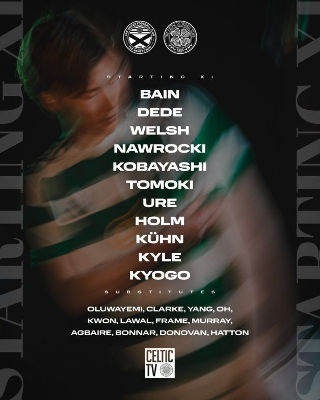 The Celtic starting eleven is Bain, Dede, Welsh, Nawrocki, Kobayashi, Tomoki, Ure, Holm, Kuhn, Kyle and Kyogo.