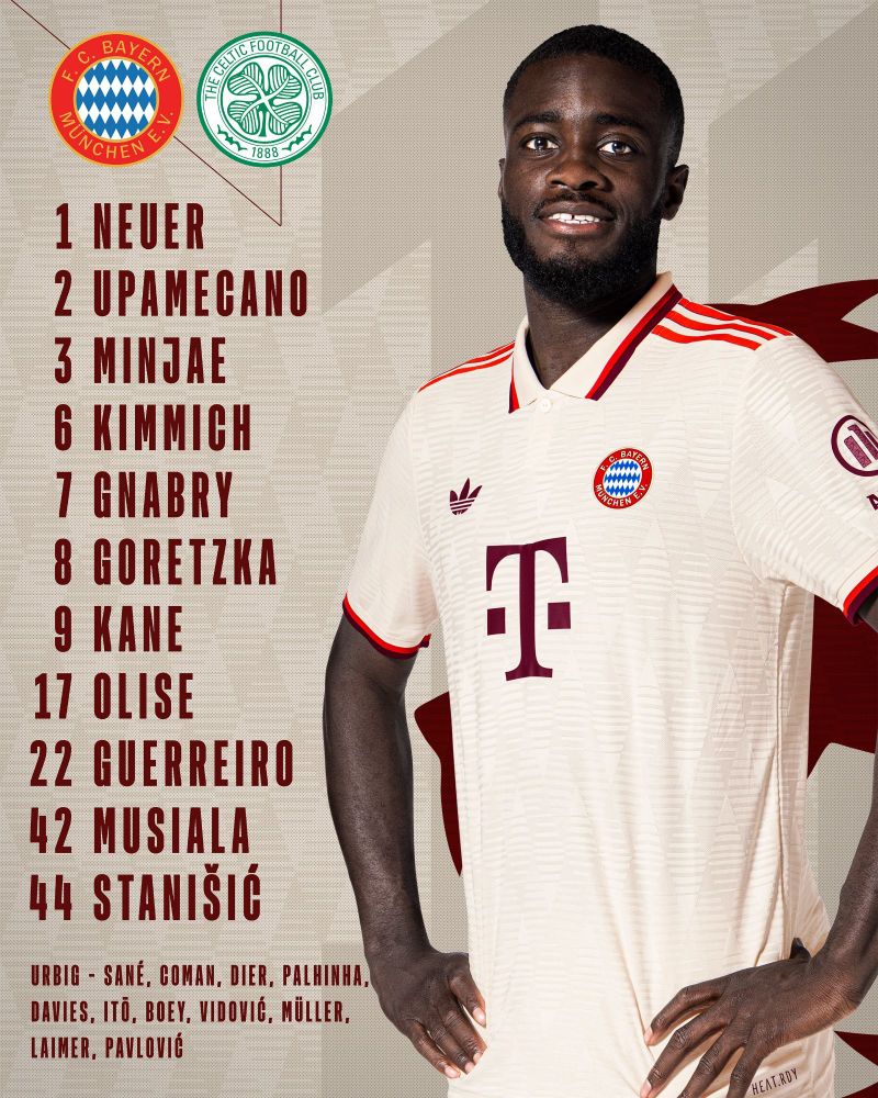 Subs: Urbig, Sane, Coman, Dier, Palhinha, Davies, Ito, Boey, Vidovic, Müller, Laimer, Pavlovic.