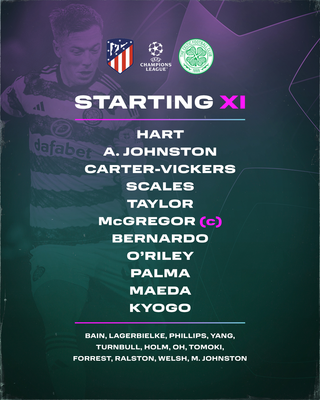 CELTIC: Hart, A.Johnston, Scales, Carter-Vickers, Taylor, McGregor, Bernardo, O’Riley, Maeda, Kyogo, Palma. Subs: Bain, Laberbielke, Phillips, Yang, Turnbull, Holm, Oh, Iwata, Forrest, Ralston, Welsh, M.Johnston