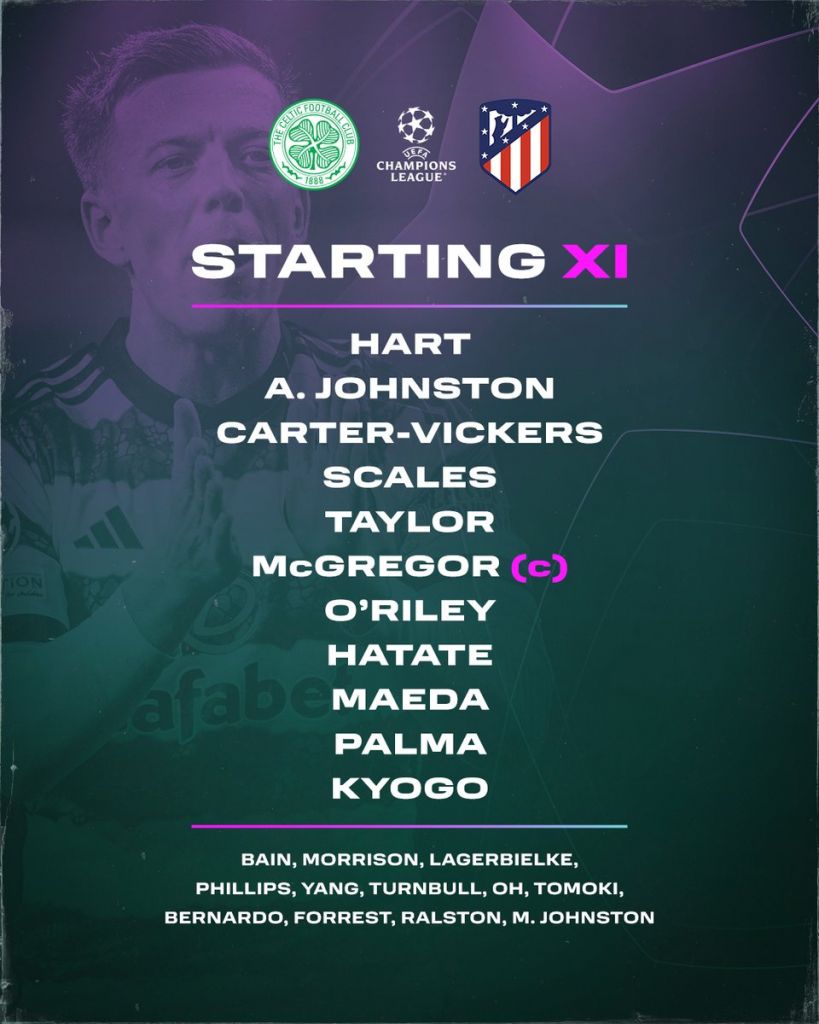 The Celtic Starting XI: Hart; A. Johnston, Carter-Vickers, Scales, Taylor; O’Riley, McGregor, Hatate; Maeda, Furuhashi, Palma