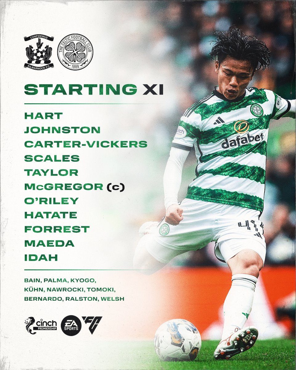 The Celtic team this evening to play Kilmarnock at Rugby Park is Joe Hart in goals, a back four of Alistair Johnston, Cameron Carter-Vickers, Liam Scales and Greg Taylor. The midfield three are the Celtic captain Callum McGregor, Matt O’Riley and Reo Hatate and the from three are James Forrest, Adam Idah and Daizen Maeda.