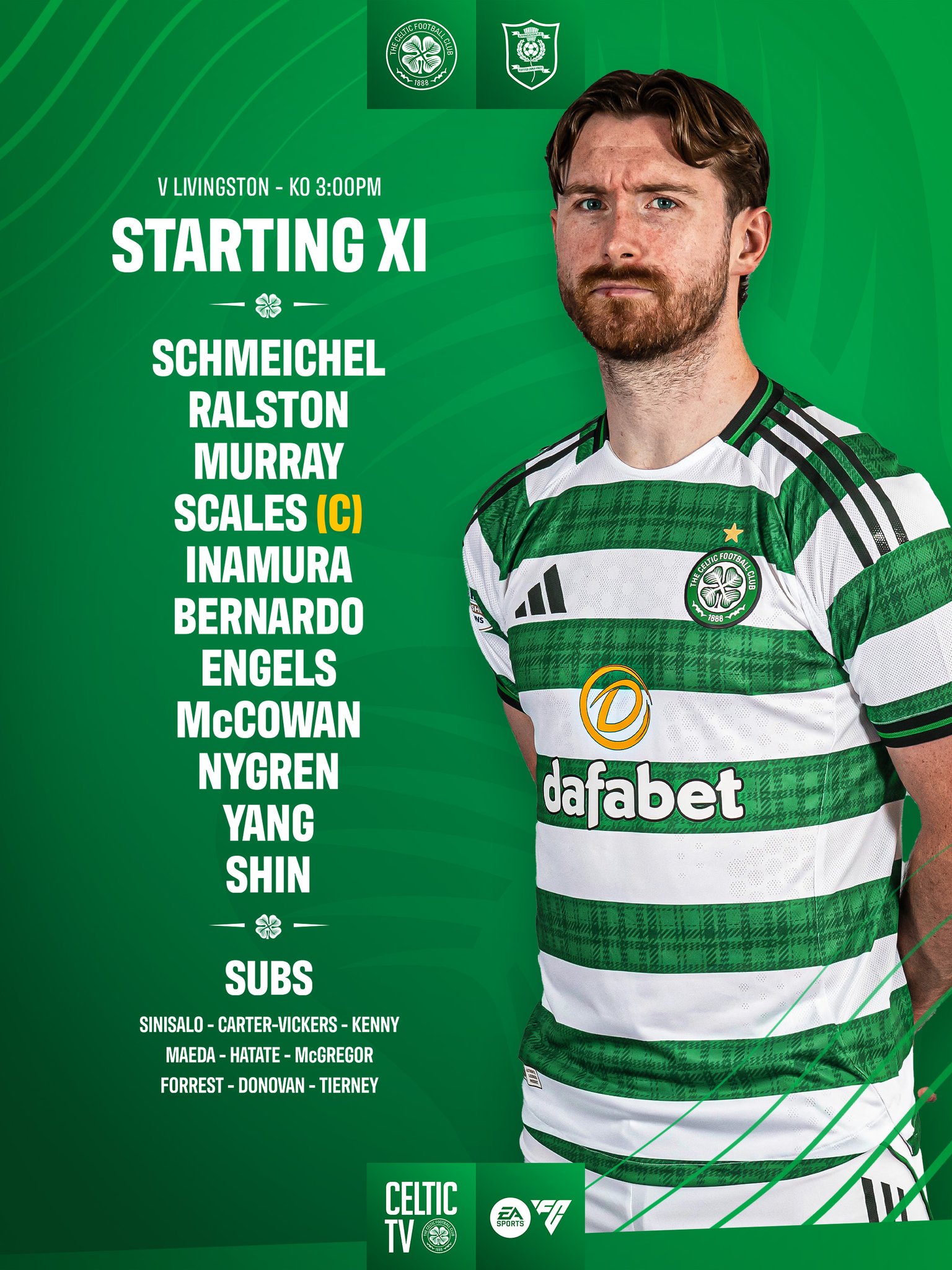 In defence, Inamura starts at left back and Tony Ralston comes into right back. Dane Murray starts alongside Liam Scales, who captains the side this afternoon.
