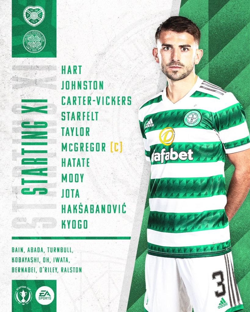 Today’s Celtic side is as follows: Hart; Johnston, Carter-Vickers, Starfelt, Taylor; McGregor, Hatate, Mooy; Jota, Kyogo, Hakšabanović.