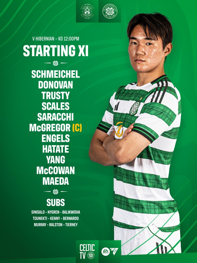 In the middle of the park Martin O’Neill is getting the best out of Arne Engels and Reo Hatate and both play alongside the Celtic captain Callum McGregor this afternoon in the centre of the park. Meanwhile Luke McCowan stays in the team the right wing/wing back role, with Daizen Maeda back through the middle and Yang on the left. All three were outstanding against Feyenoord.