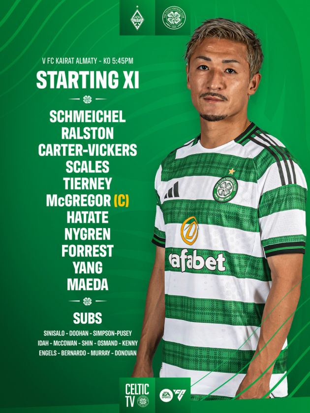 The Celtic captain Callum McGregor is joined in the middle of the park by Reo Hatate and Benjamin Nygren while the front three sees James Forrest and Yang on the wings and Daizen Maeda returning to his favoured position as centre-forward.
