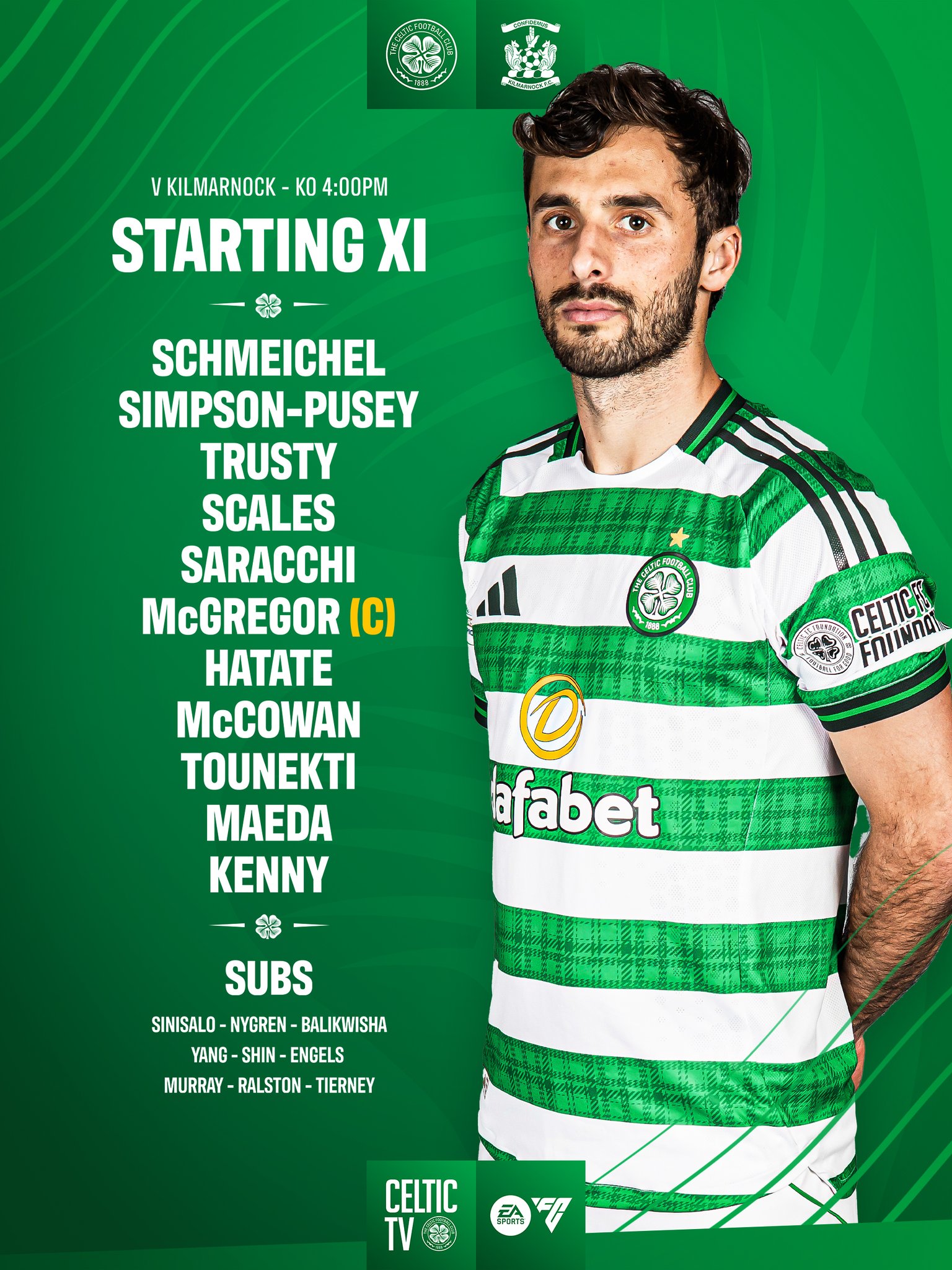 The Celtic team to face Kilmarnock this afternoon is as follows: Kasper Schmeichel; Jahmai Simpson-Pusey, Auston Trusty, Liam Scales, Marcelo Saracchi; Callum McGregor (c), Reo Hatate, Luke McCowan; Daizen Maeda, Johnny Kenny and Sebastian Tounekti.