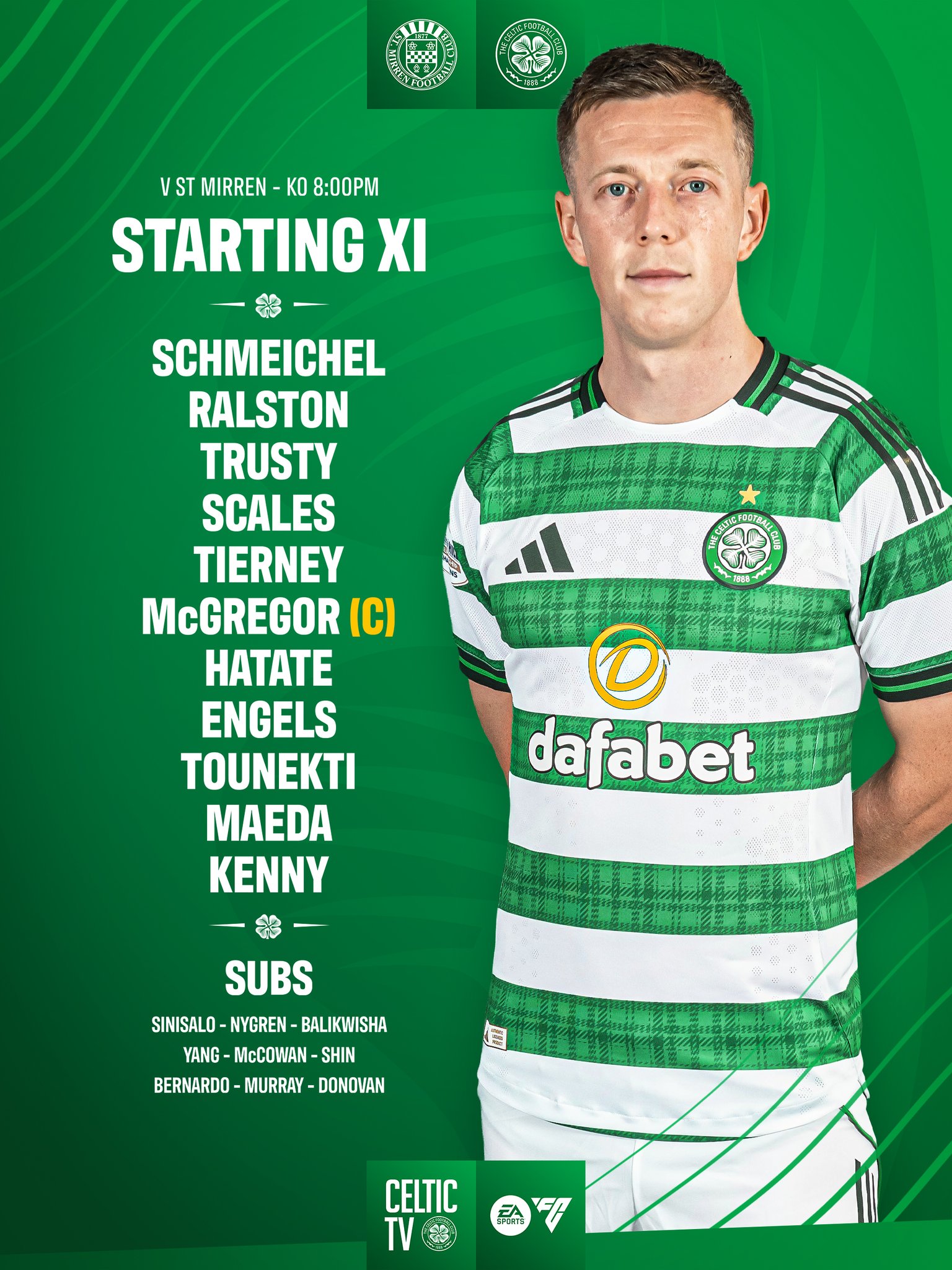 In the middle of the park the Celtic captain Callum McGregor is joined by Reo Hatate and Arne Engels with the forward line for Celtic this evening consisting of Daizen Maeda, Johnny Kenny and Sebastian Tounekti.