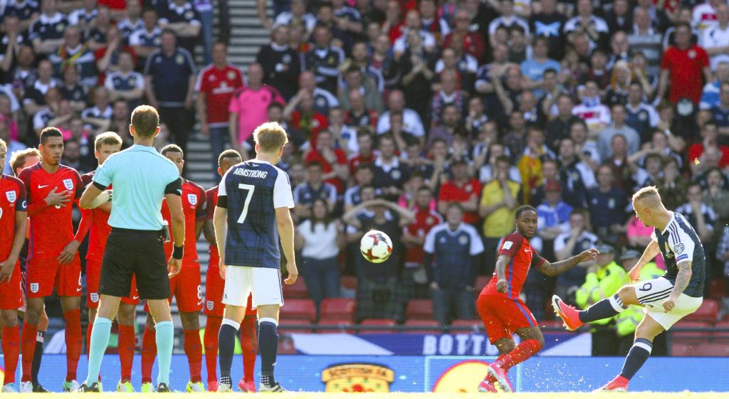 June 10th 2017 Hampden Park Glasgow Scotland World Cup 2018 Qualifying Football Scotland versus England Leigh Griffiths Scores A Free Kick to Make It 1 1 in The 87th Minute. Photo Vagelis Georgariou