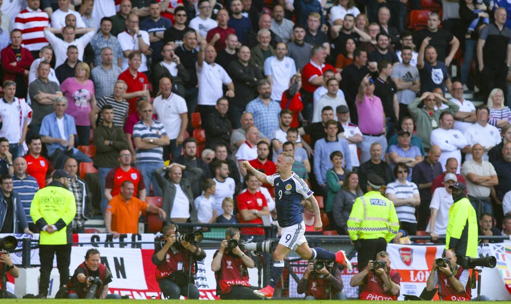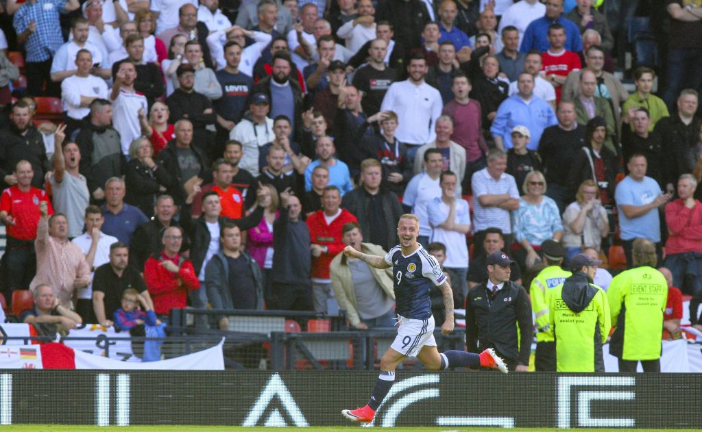 June 10th 2017, Hampden park, Glasgow, Scotland; World Cup 2018 Qualifying football, Scotland versus England; Leigh Griffiths leaps to celebrate his goal that made it 2-1 in the 90th minute. Photo Vagelis Georgariou