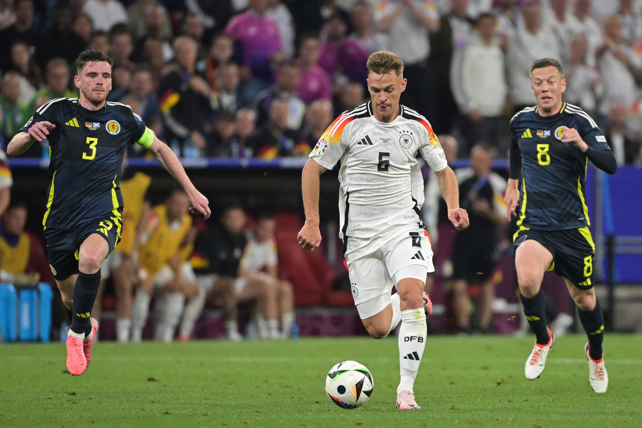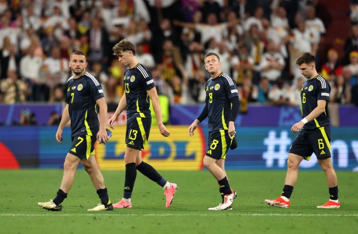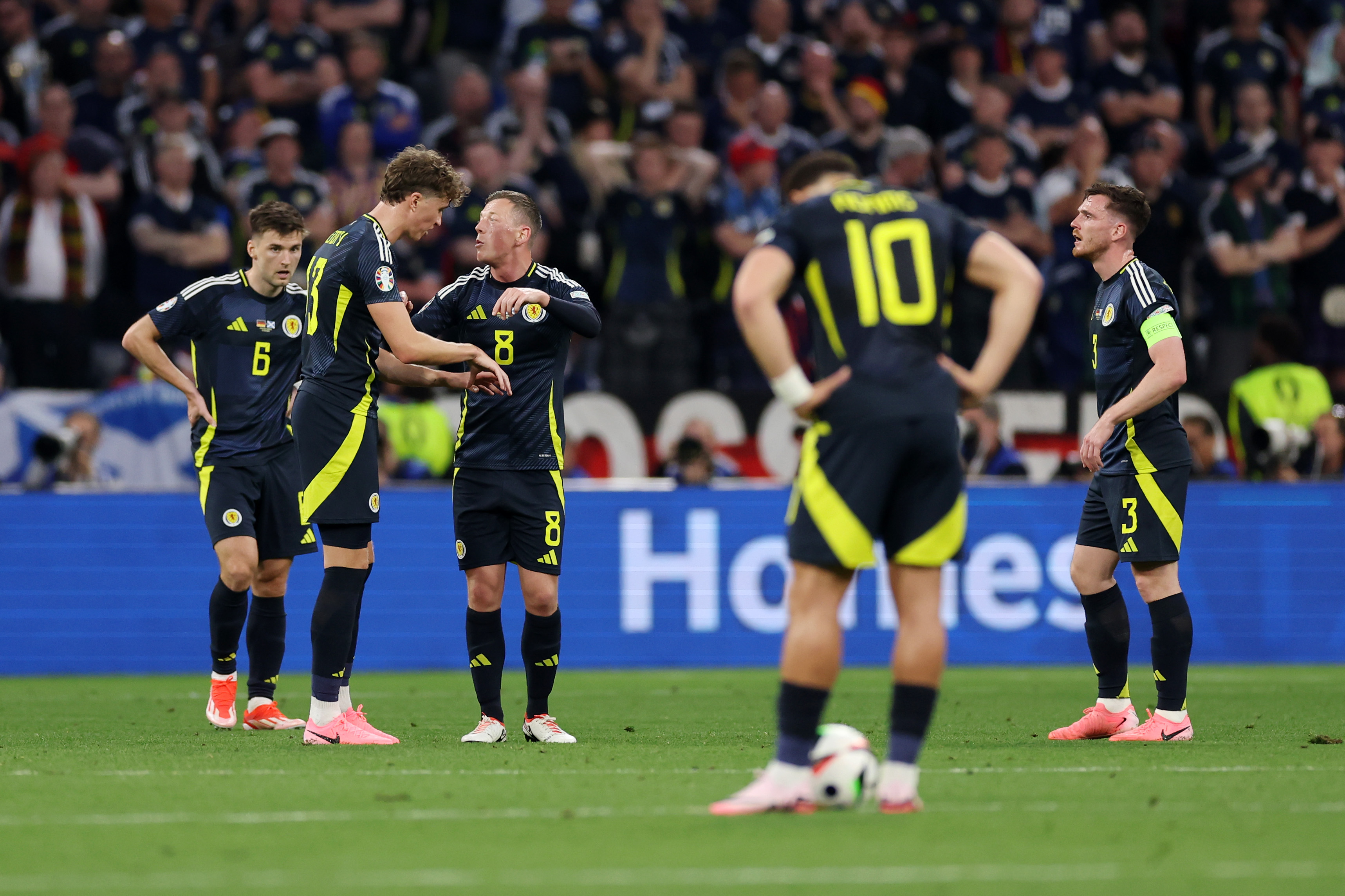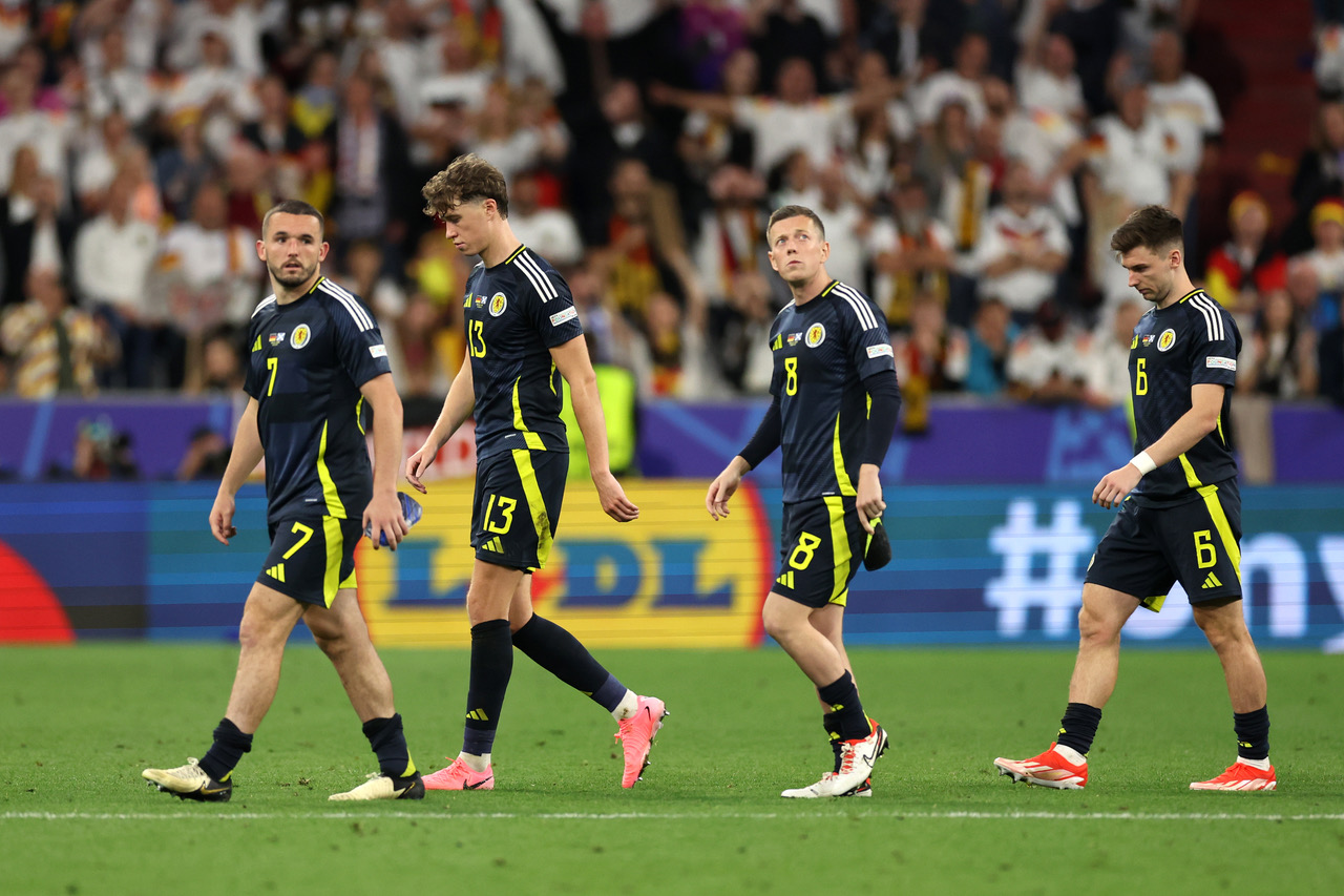 Jack Hendry  with teammate Callum McGregor after Jamal Musiala of Germany  scores his team’s second goal during the UEFA EURO 2024 group stage match between Germany and Scotland at Munich Football Arena on June 14, 2024. (Photo by Carl Recine/Getty Images)