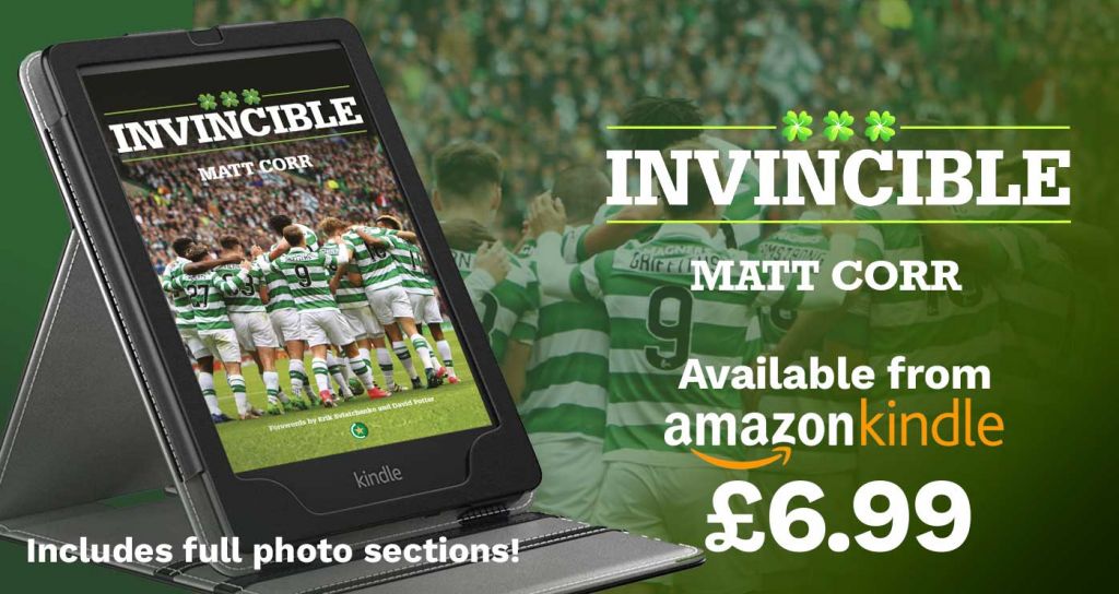 INVINCIBLE is Matt Corr’s stunning debut as a published Celtic author. With forewords from Celtic Invincible Erik Sviatchenko and renowned Celtic author and historian, David Potter, INVINCIBLE tells the story of the grand old Glasgow football club’s record-breaking 2016/17 season through the perspective of a lifelong Hoops supporter who follows the Bhoys as events unfold which could not possibly have been envisaged by the worldwide Celtic diaspora just 12 months earlier.