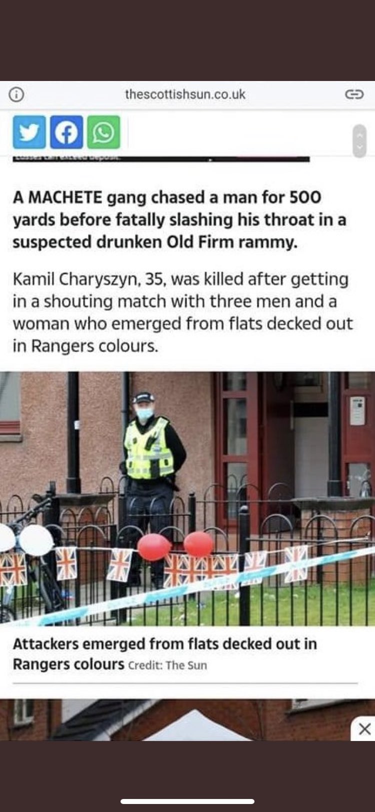“A 35 year old Celtic Fan, Kamil Charyszyn was chased and killed at weekend in Glasgow by 3 men and 1 woman in Rangers colours, They slit his throat with a machete. Pure evil”…