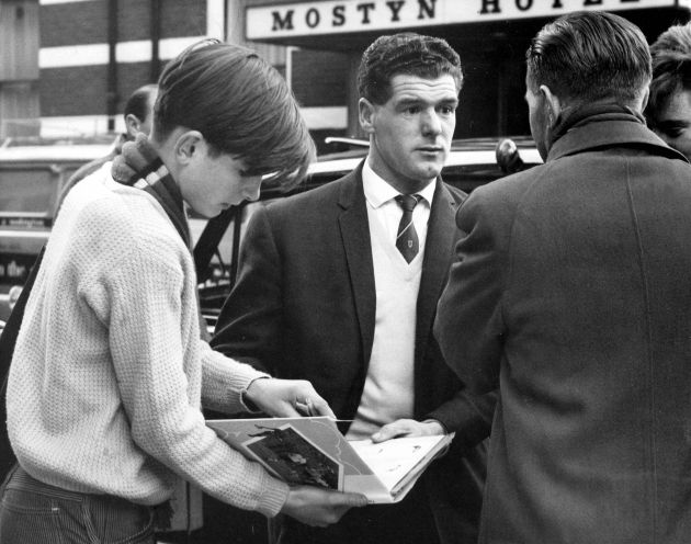 imago/United Archives International Bobby Shearer, the Glasgow Rangers captain, outside the Mount Royal Hotel with autograph hunters, ahead of their game with Tottenham Hotspur in the first leg of their European Cup Winners Cup tie. 31st October 1962